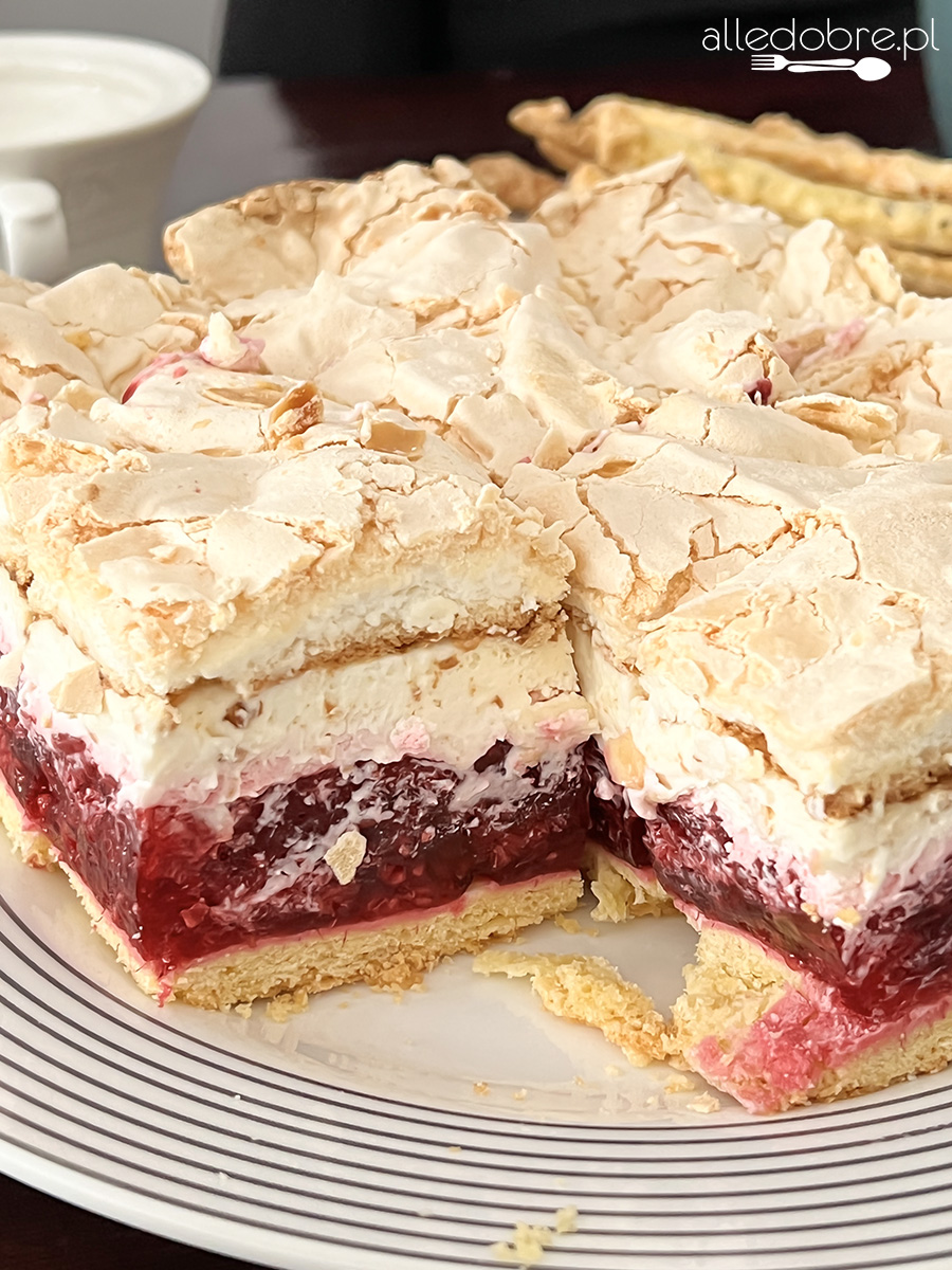Najlepszy i sprawdzony przepis na ciasto malinowa chmurka! Kruchy spód, maliny w malinowej galaretce, kremowa masa śmietankowa i chrupiąca beza to połączenie, któremu nikt się nie oprze.