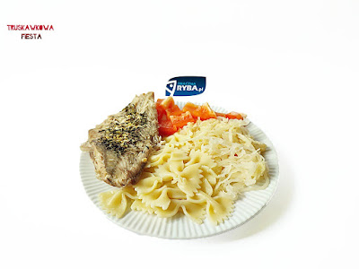 Flądra z kiszoną kapustą, papryką czerwoną i makaronem