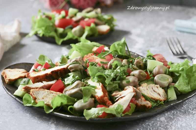 Sałatka z bobem i kurczakiem. Ta sałatka z pyszną porcją warzyw i grillowaną piersią z kurczaka i odrobiną odważnego, bogatego w smaku sosu z dodatkiem musztardy i octu ryżowego to