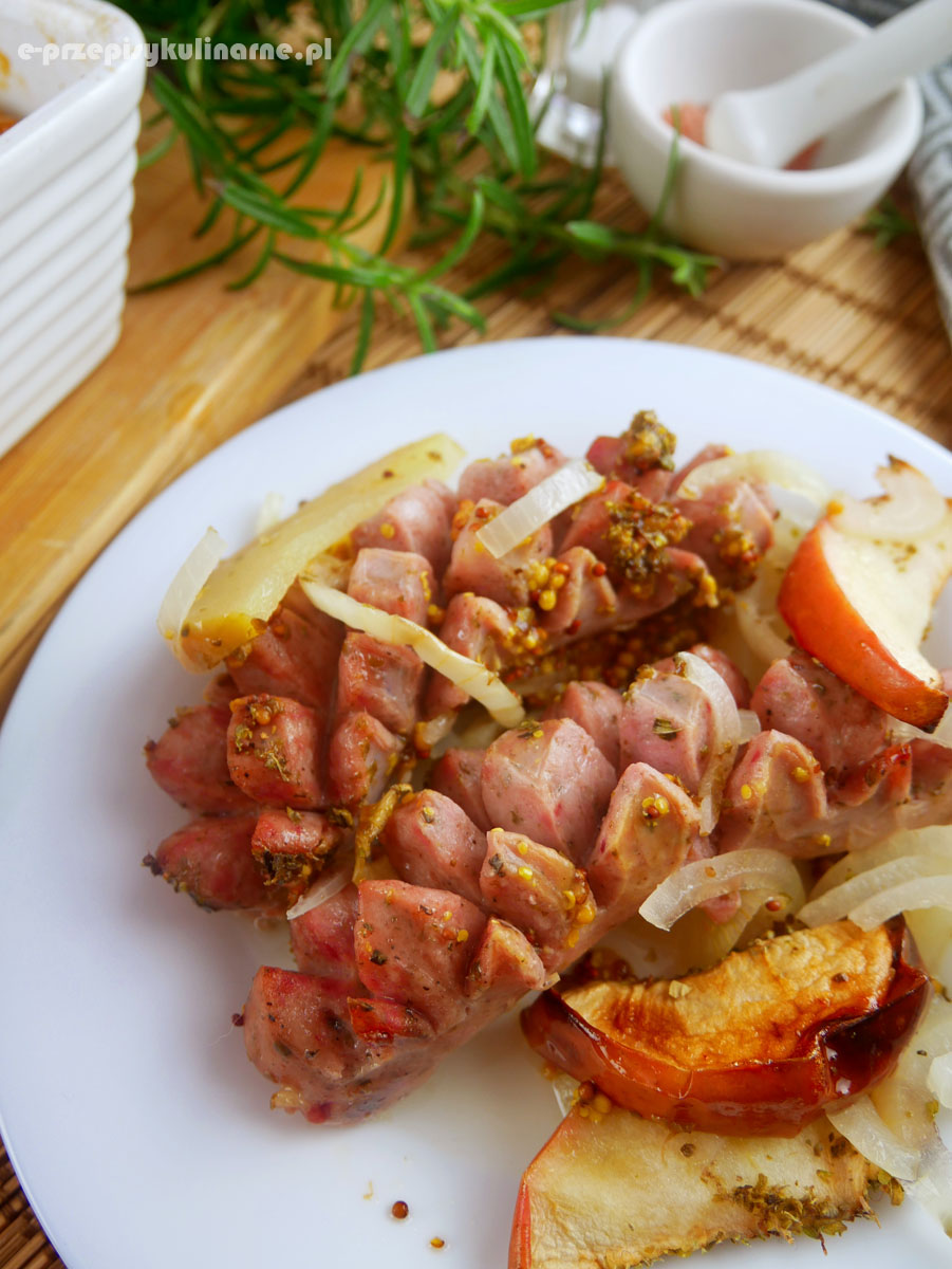 Biała kiełbasa zapiekana z jabłkami