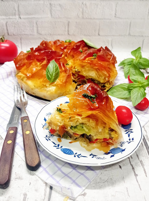 Cudowne chrupiące warstwy ciasta filo z nadzieniem warzywnym. Pycha 🙂 Smakuje na ciepło i na zimno z sosem czosnkowym.