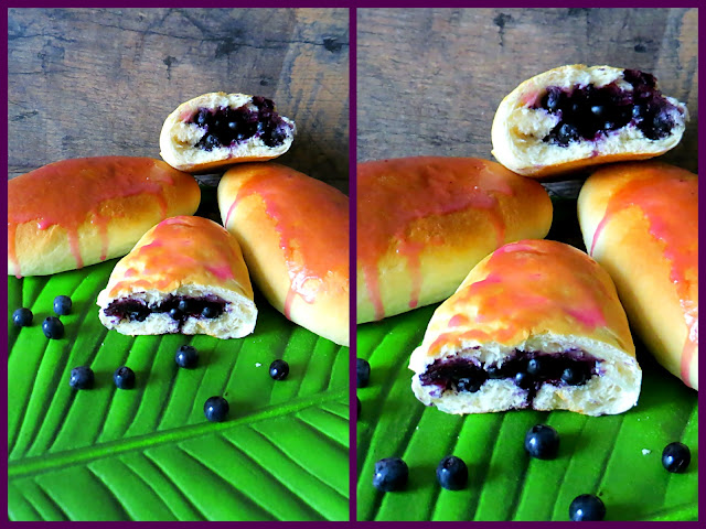 Domowe jagodzianki wypełnione mnóstwem jagód. Pyszne ciasto i lukier z sokiem jagodowym.