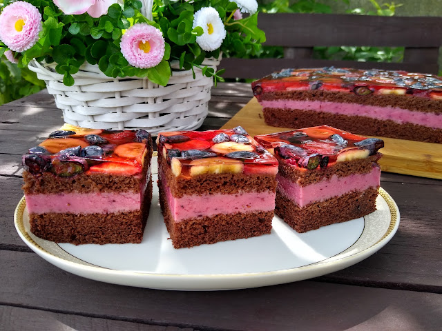 Kolejne ciasto z owocami, które stworzyłam z tego co było pod ręką. Nie umiem wymyślac nazw więc jest po prostu ciasto owocowe Moni. Do ciasta wykorzystałam ostatnie chyba w tym sezonie truskawki i jagody kamczackie oraz dojrzałe banany. Jest puszysty biszkopt, masa owocowo-serowa, owoce i galaretka czyli idealne ciasto na