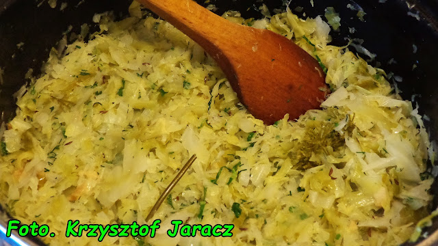 Kapustę oczyść, opłucz pod bieżącą zimną wodą , poszatkuj nożem na