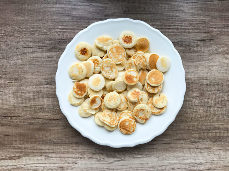 Urocze maleńkie placuszki naleśnikowe wielkości płatków śniadaniowych, podane na słodko z mini…