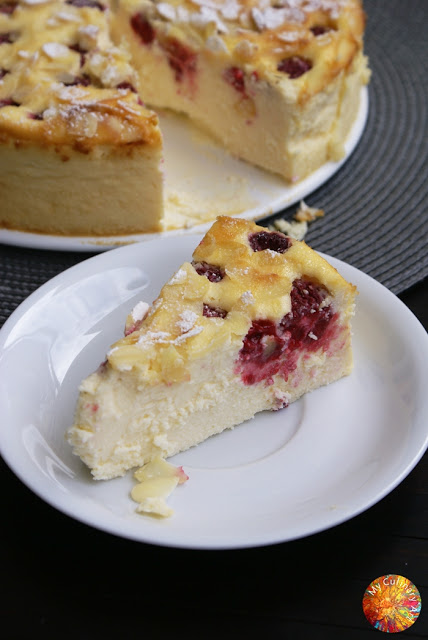 Kremowy, rozpływający się w ustach sernik z malinami i płatkami migdałów. Mniam…