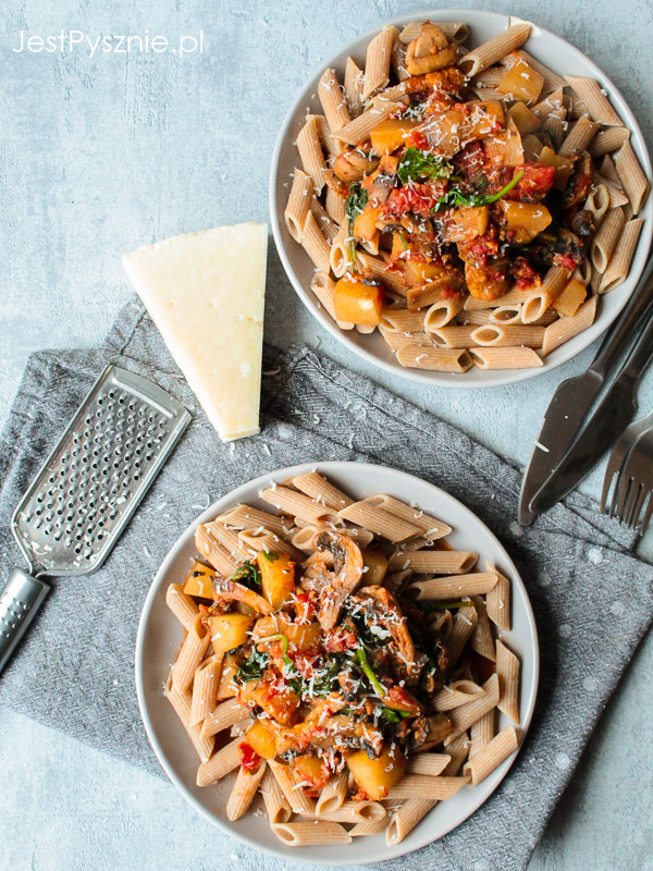 Makaron z dynią, pieczarkami, szpinakiem i pomidorami