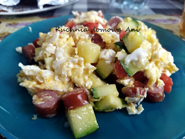 2 jajka1 cienka kiełbaska śląska lub frankfurterkakawałek cukiniikawałek czerwonej paprykiolej i odrobina masła do smażenia