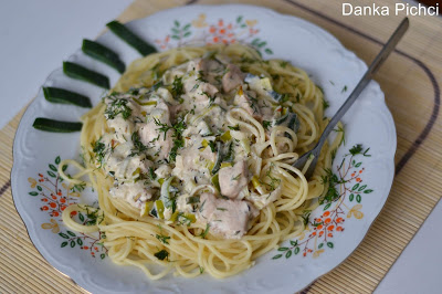 Spaghetti z kurczakiem w sosie porowym