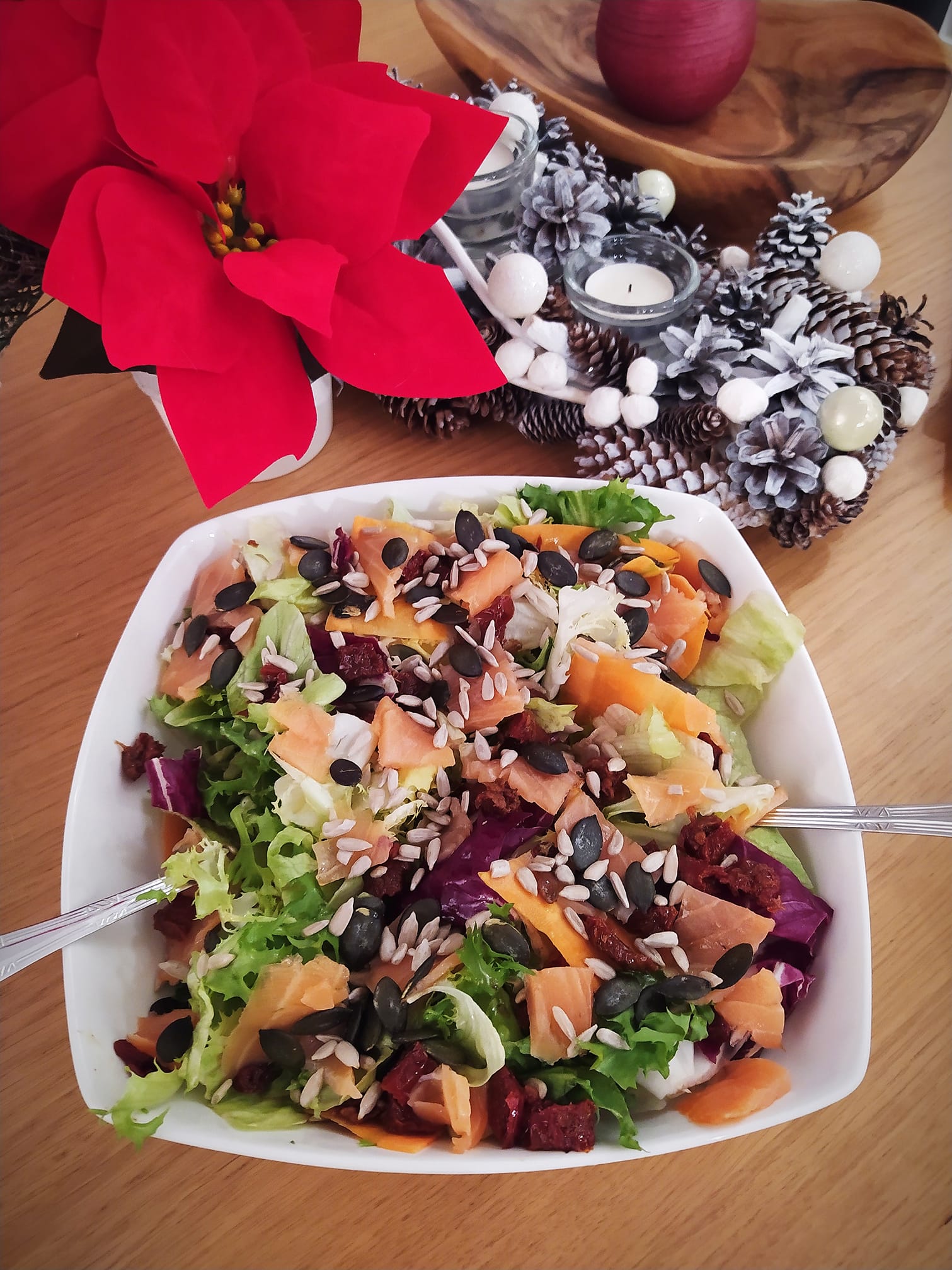 mix sałatpół słoiczka suszonych pomidorówłosoś sałatkowy lub w plastrach (wędzony)pół garści pestek dynipół garści słonecznika