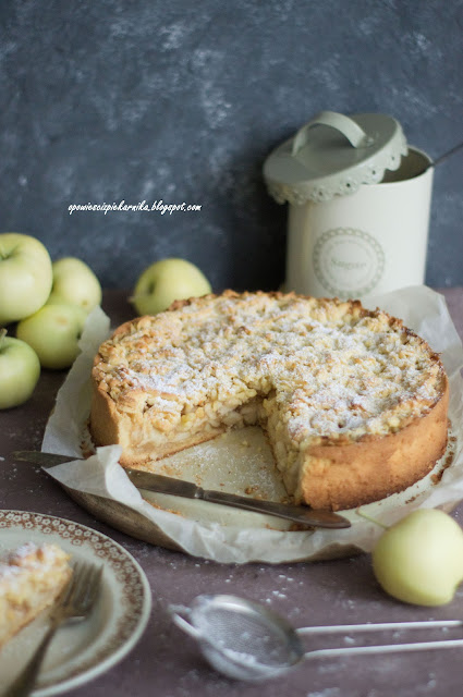 Dzisiaj przepis na pyszną szarlotkę z papierówek :). Powstała w zasadzie na życzenie moich domowników, ale sama też miałam chęć na taką domową szarlotkę, tym bardziej, że w ogrodzie papierówek w bród – pasowało więc choć raz upiec coś z ich udziałem ;). Papierówki są o tyle wdzięcznym gatunkiem jabłek