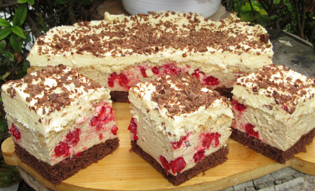 Składa się z cienkiego kakaowego biszkoptu, pianki cappuccino z zanurzonymi malinami, krakersów oraz z kremu. Wydaje się czasochłonne, ale takie nie jest.