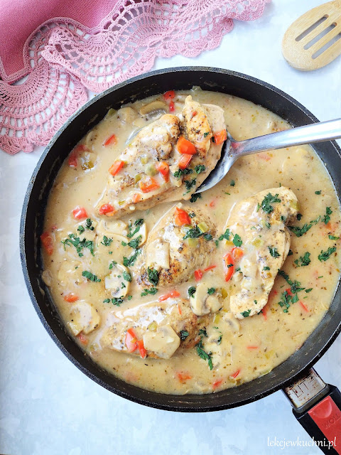 Kurczak w sosie śmietanowym z pieczarkami i papryką