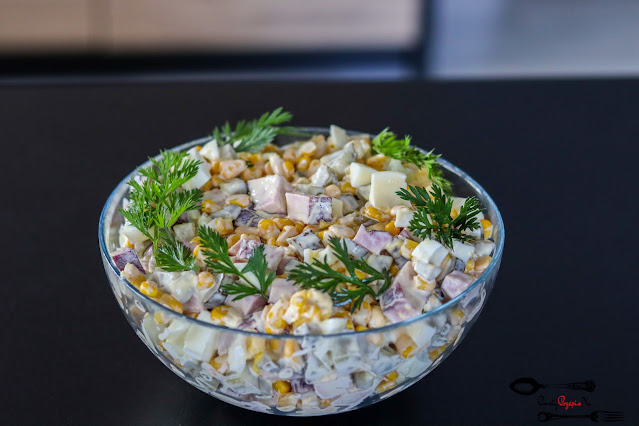 Przepis na tę sałatkę znalazłam na starej kartce w zeszycie mamy – szybka, łatwa, więc zrobiłam ją ostatnio na kolację. Jest pyszna 🙂
