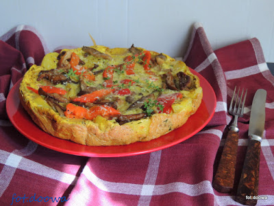 Omlet ziemniaczany z boczniakami i pieczoną papryką