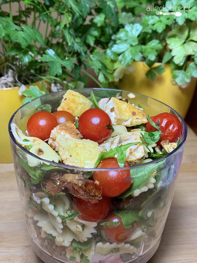 Sałatka dzięki zawartości tylu składników jest bardzo sycąca i smaczna. Idealne sprawdzi się jako posiłek do pracy, na kolację a nawet na obiad. Taką sałatką możemy również