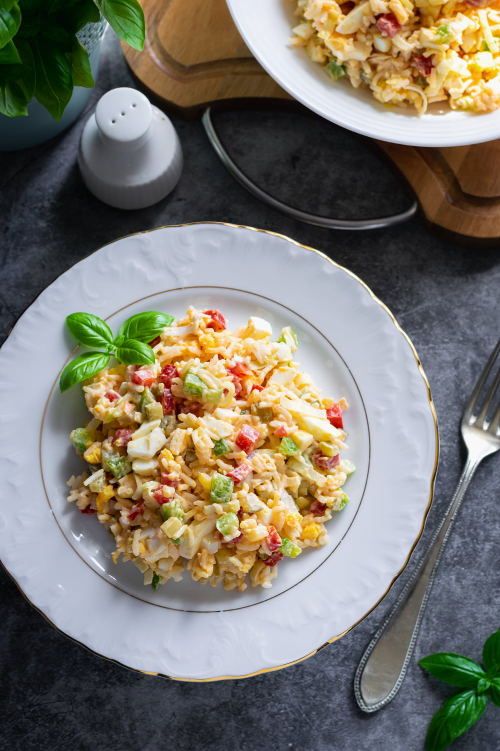 Prosta sałatka ryżowa z chrupiącą papryką czerwoną i zieloną, ogórkiem konserwowym, porem oraz jajkami. Sałatka ładnie prezentuje się na talerzu i moim zdaniem jest dosyć uniwersalna.