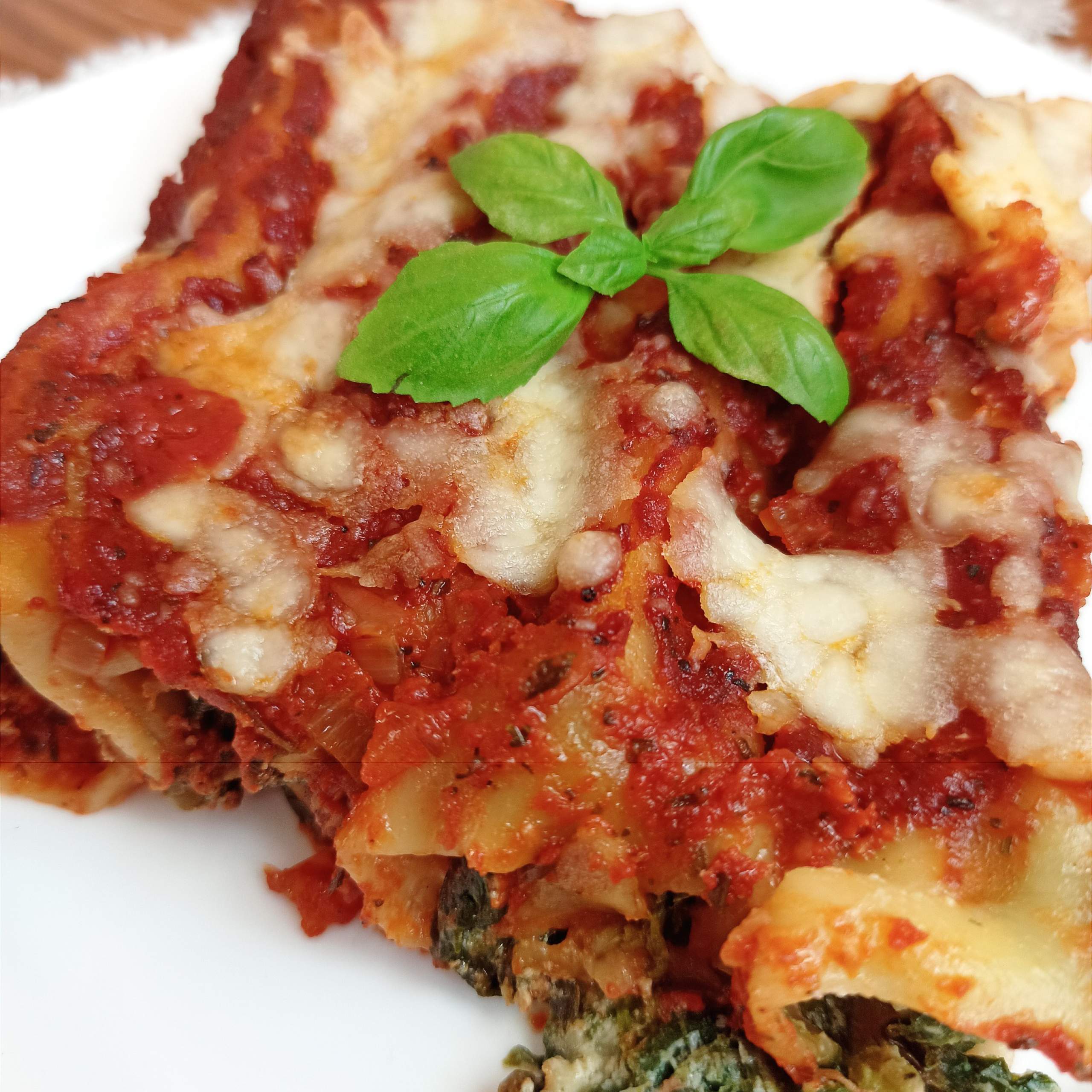 Cannelloni, czyli makaron grube rurki nadziewany szpinakiem z dodatkiem ricotty, sera Dziugas i jajka, zapiekany pod sosem pomidorowym i tartą mozzarellą.