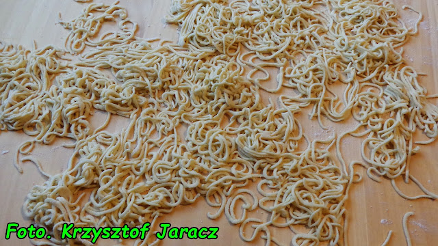 Mąkę przesiewamy na stolnicę , na środku robimy dołek. Do dołka wbijamy jajko, wlewamy wodę , dodajemy sól. Wyrabiamy cisto na jednolitą konsystencję . Ciasto nie powinno