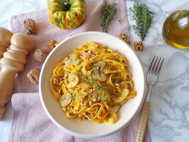SKŁADNIKI 500 g makaronu typu fettuccine400 g pieczarek300 g dyni40 g orzechów…