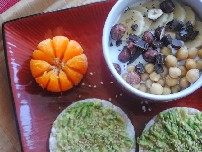 642. Jogurt z bananem, cieciorką i orzechami, wafle z awokado, sezamem i solą