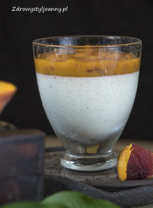 Panna cotta z brzoskwiniami. Pyszny kremowy deser z brzoskwiniami. Deser zrobiony z jogurtu greckiego, mleka owsianego a całość pokryta soczystymi i słodkimi brzoskwiniami. Przygotowanie tego