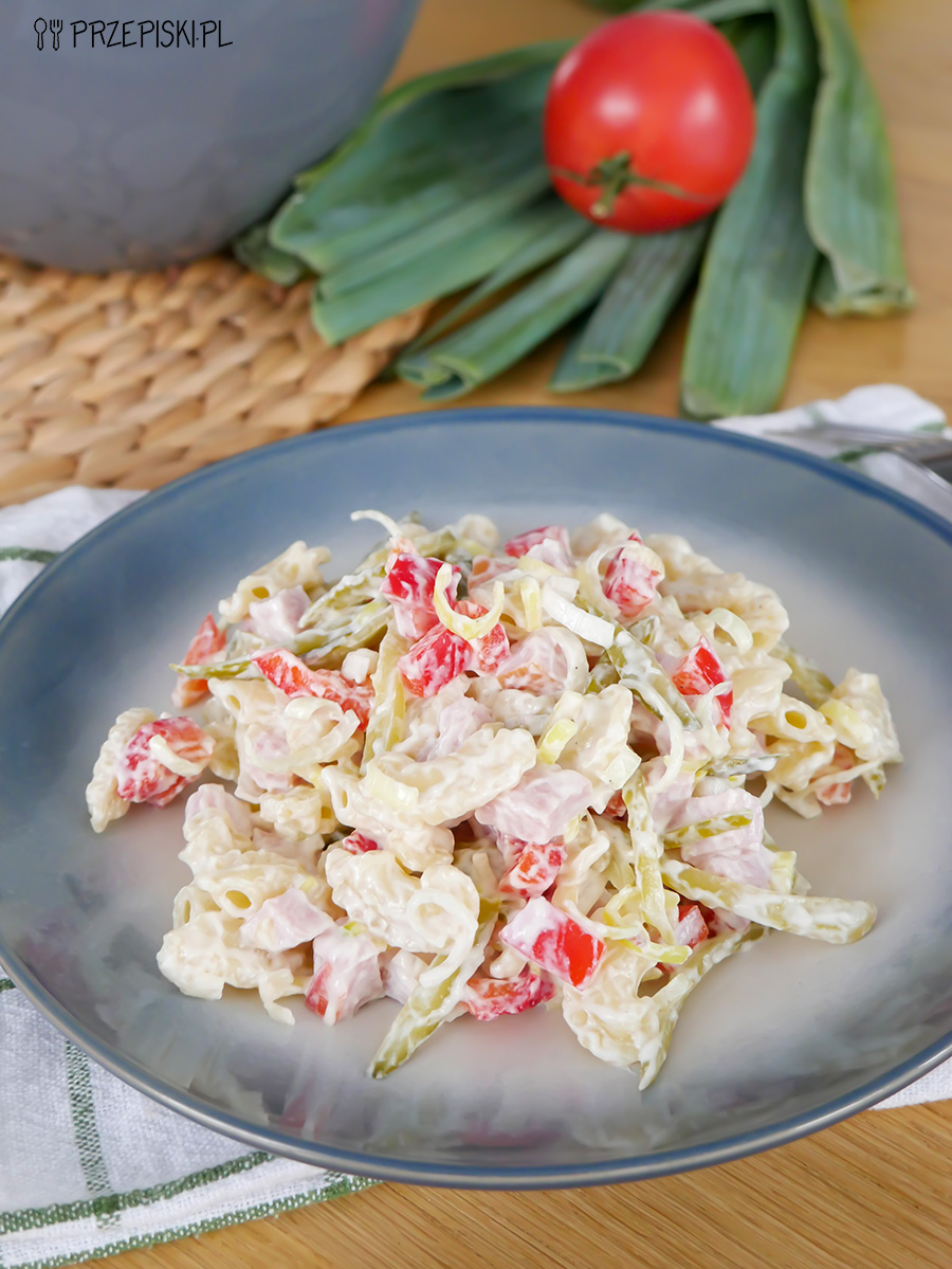 Do przygotowania sałatki zbójnicka potrzebny nam będzie makaron, szynka, papryka, por oraz ogórki konserwowe.