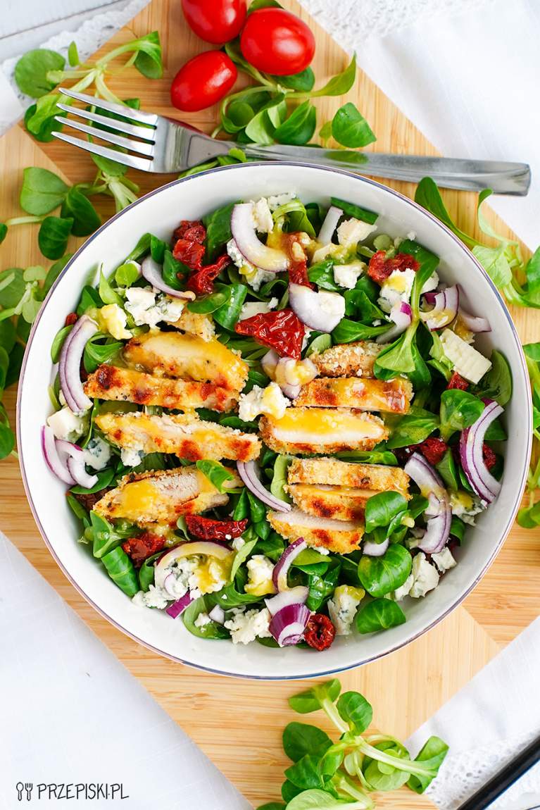 Pyszna sałatka z kurczakiem w chrupiącej panierce, roszponką, serem z niebieską pleśnią…
