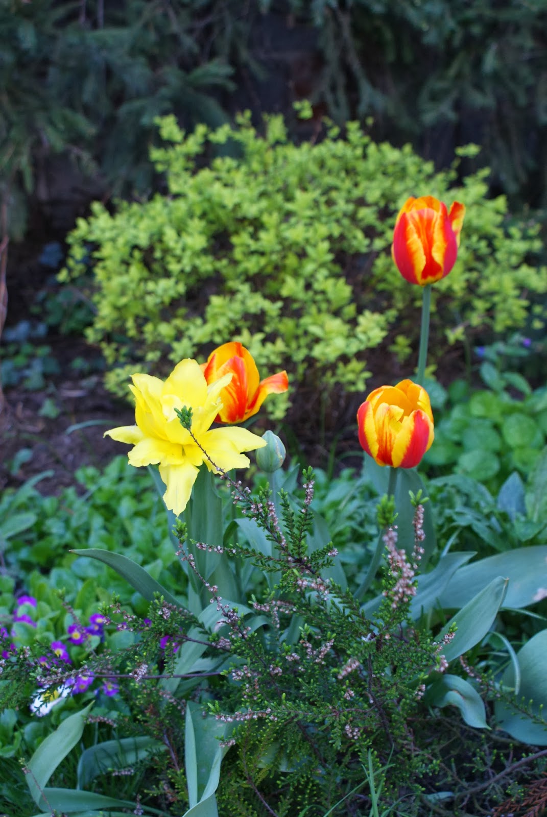 Tulipany rosną w przytulnym zakątku mojego ogrodu w towarzystwie wrzosów i pierwiosnków.…