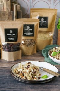 Składniki:250 g twarogu chudego20g orzechów pekan120 g świeżych fig150 g gruszki225 g pomidorków koktajlowych150 g papryki czerwonej (bez nasion)160 g miksu sałat z rukolą10 ml oleju