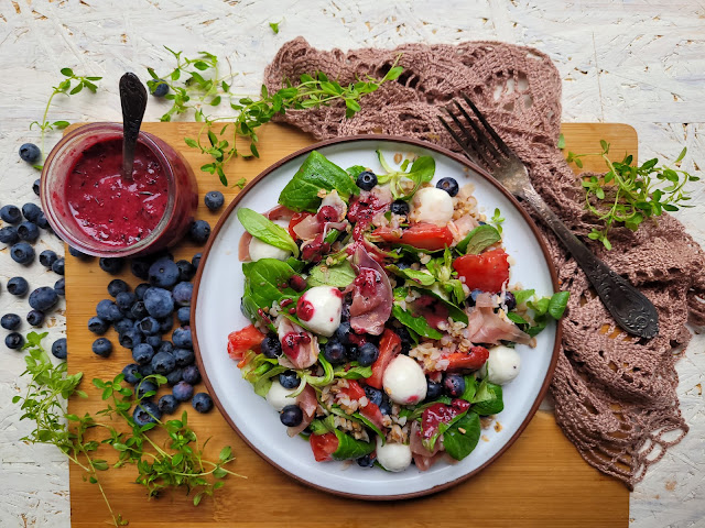 Jak wiecie u nas zawsze zostaje trochę kaszy gryczanej z obiadu. Tak się dzieje i już, dlatego dziś kolejna odsłona sałatki z kaszą gryczaną w ramach „no waste” 🙂 Lekka, kolorowa, z tego co akurat było pod ręką, i tu się pochwalę-borówki z naszego ogródka – doczekaliśmy się