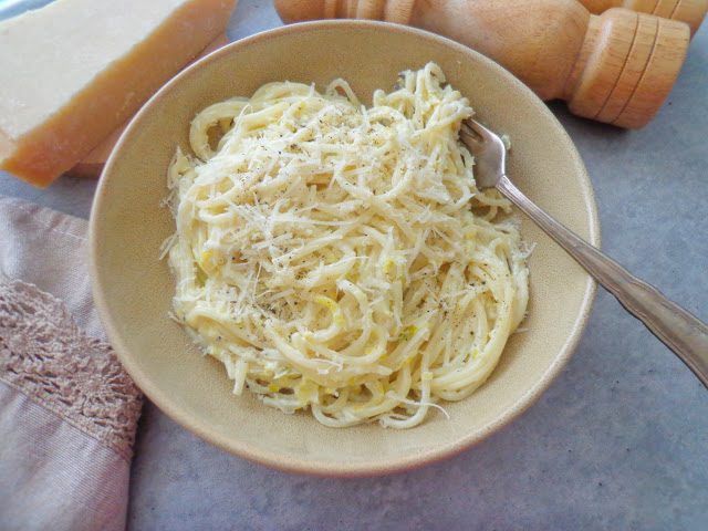 SKŁADNIKI 400 g spaghetti2 pory1-2 ząbki czosnku200 ml śmietanysól, pieprzparmezanoliwa z oliwek****INGREDIENTI400…