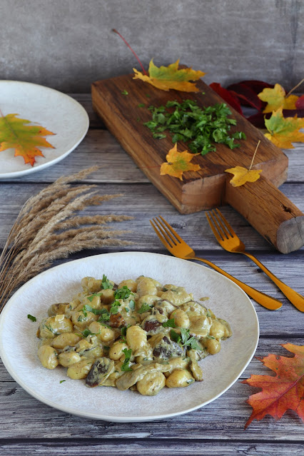 Gnocchi z grzybami, cebulą i śmietaną, to szybka i smaczna potrawa. Jeżeli uwielbiacie grzyby, to można ich ilość w potrawie zwiększyć do 1 kg. Ja wykorzystałam tegoroczne zamrożone grzyby i miałam ich akurat 600 g. Gnocchi możecie oczywiście przygotować samodzielnie. Ja skorzystałam z gotowego gnocchi dostępnego w