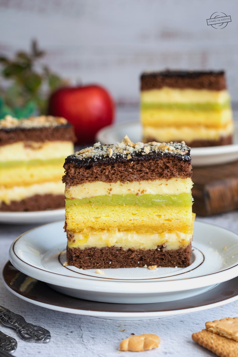 Przekładaniec jabłkowo-budyniowy to dwa rodzaje ciasta biszkoptowego, jasne i kakaowe, przełożone masą jabłkową (starte, uprażone jabłka usztywnione galaretką) i kremem karpatkowym. Ciasto jest smaczne, wysokie i wizualnie pięknie się prezentuje, ale myślę, że niedoświadczone gospodynie mogą mieć z nim problem.