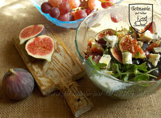 garść winogron2 figi60 g sera pleśniowegoziarna słonecznika, sezamu, dynikilkanaście listków rukolikilka roszponekoliwasok…