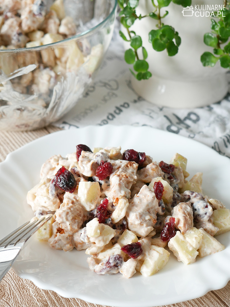 Sałatka ma bardzo ciekawy smak, lekko słodkawy od jabłka i żurawiny, a zarazem słony od kurczaka.