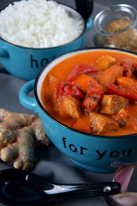 Jeśli szukacie wegańskiego przepisu na pyszne, aromatyczne, rozgrzewające danie, sięgnięcie w strone indyjskich smaków to dobry krok. To pyszne curry z pieczonej papryki i batatów to przepyszna propozycja na szybki obiad. Pachnąca i rozgrzewająca od przypraw, w kremowym pomidorowo-kokosowym sosie, dla mnie to opis miseczki pełnej smakowitego szczęścia. Musicie