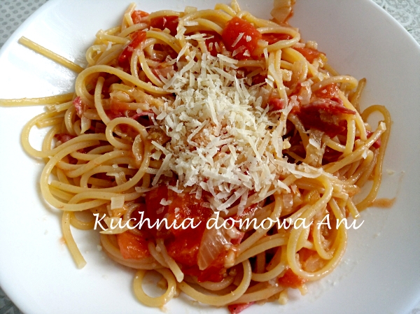 Spaghetti z pomidorami i salami