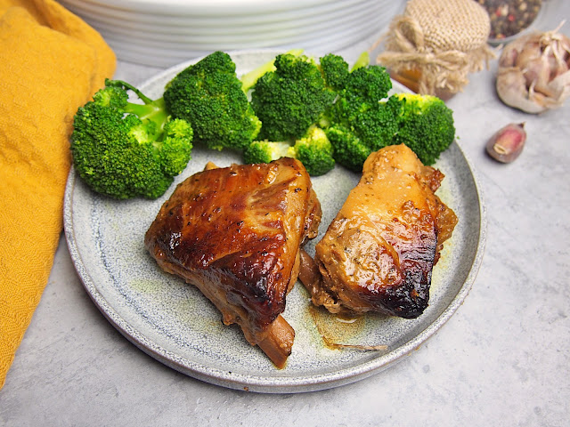 Dziś przychodzę do Was z pomysłem na obiad, który robi się praktycznie sam. Wystarczy tylko wymieszać składniki marynaty, wrzucić do niej mięso i poczekać kilka godzin, a następnie upiec. A po upieczeniu delektować się soczystym, miękkim mięskiem. Do pieczenia dodałam dużą cebulę, bo uwielbiam gdy mięso piecze