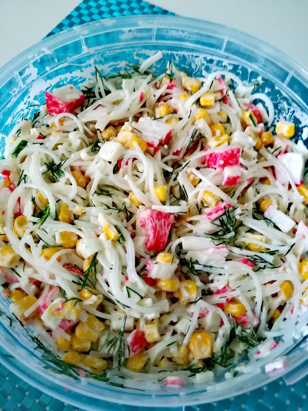 1 opakowanie paluszków krabowych1 puszka kukurydzy100 g makaronu sojowegokoperek