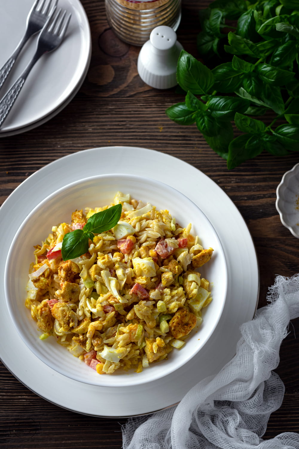Sałatka z jajkiem, kurczakiem, porem, papryką, kukurydzą i makaronem orzo. Wyszła ok, ale jak dla mnie TYLKO ok.