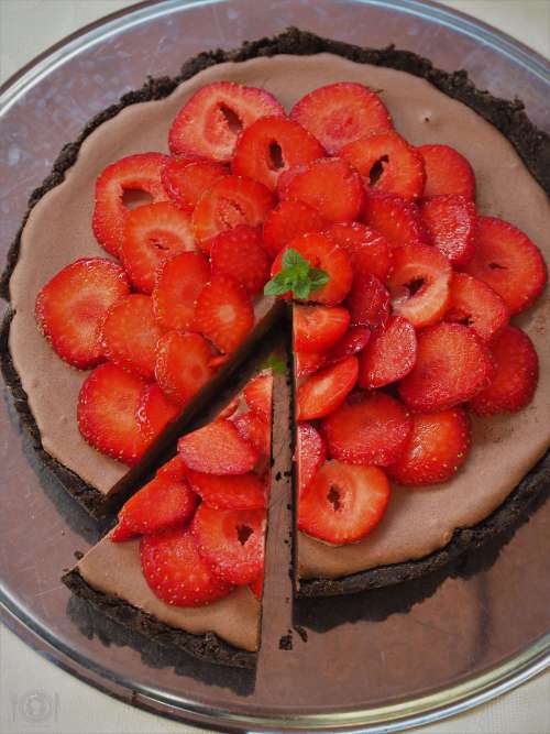 Keto ciasto z musem czekoladowym i truskawkową rozetą Czekolada i truskawki dla…