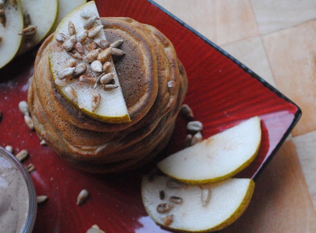 497. Słonecznikowe placki z gruszką, pomelo, jogurtem karobowym