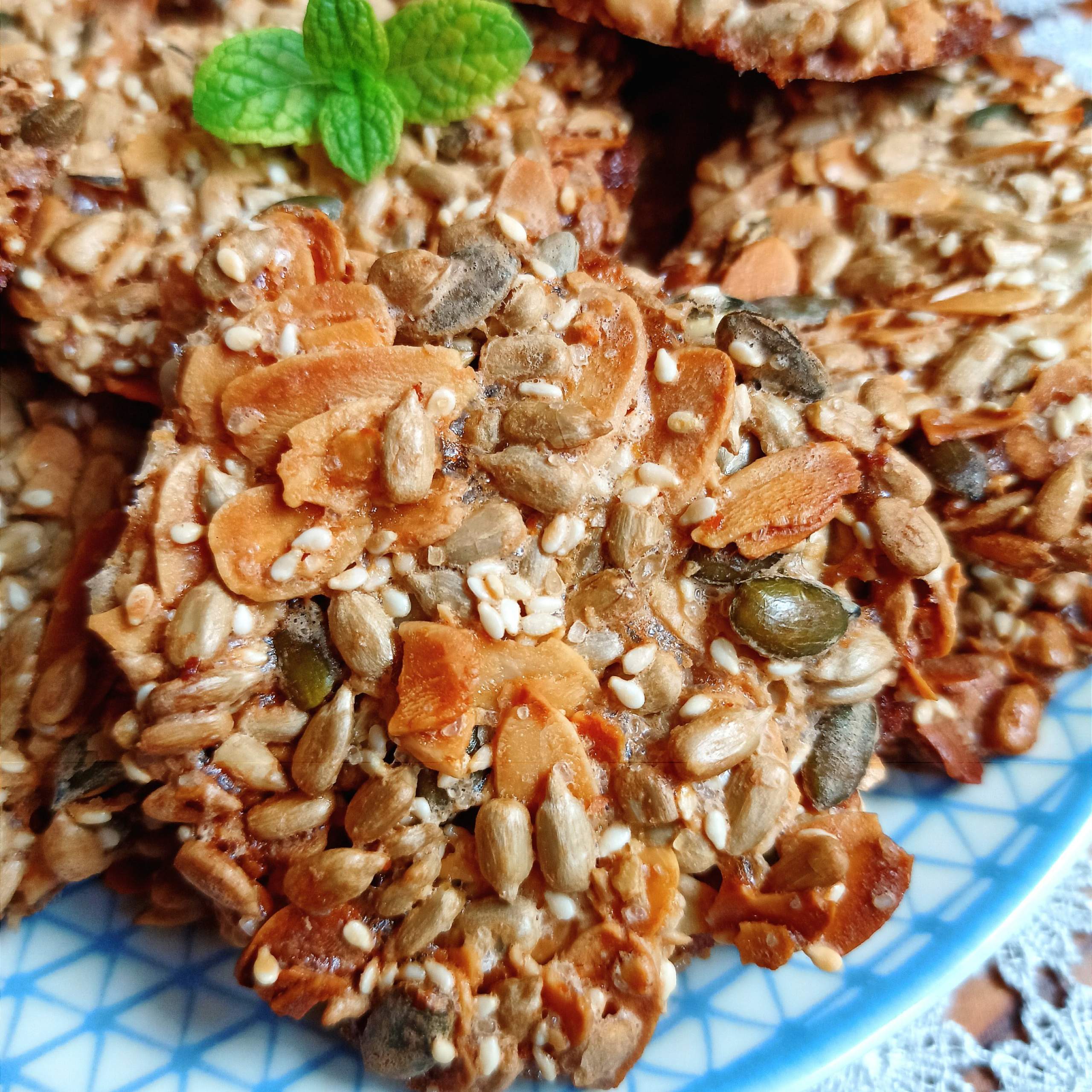 Obłędnie pyszne ciasteczka składające się prawie z samych ziaren: pestek słonecznika i dyni, płatków migdałowych i sezamu. Oj, trudno się od nich oderwać!