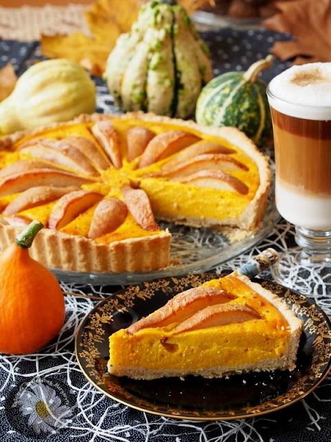 Mój mąż ma czasem pomysły… zachciało mu się tarty dyniowej. No to dobra żona wymodziła. Nie miałam na nią pomysłu, przejrzałam kilka przepisów w internecie, ale nic mi nie przypasowało na tyle, abym chciała to przenieść do swojej kuchni. Niewątpliwie jednak zainspirowałam się choćby pomysłem na dodanie gruszek