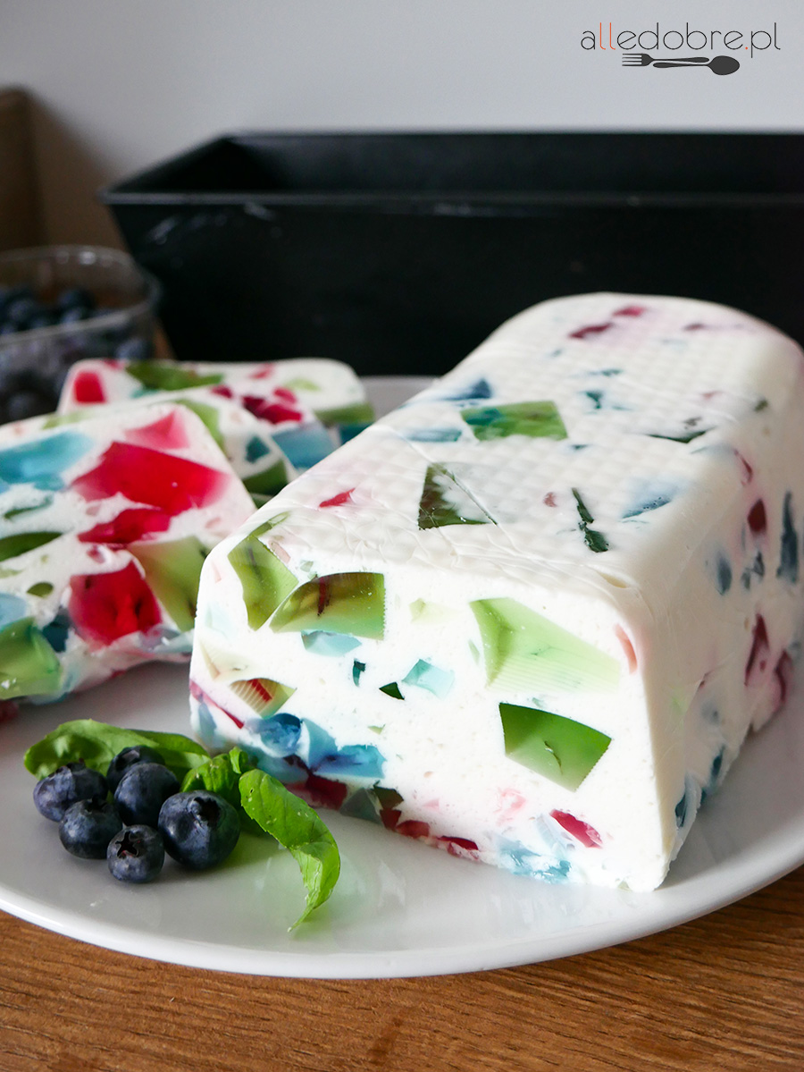 To białe ciasto bez pieczenia z kawałkami kolorowych galaretek przygotowuje się