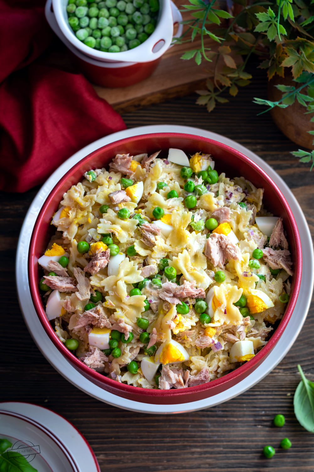 Uwielbiam sałatki makaronowe i uwielbiam sałatki z tuńczykiem, a makaronowa sałatka z tuńczykiem to już kombinacja wprost stworzona dla mnie Tym razem bardzo fajne połączenie z jajkami, zielonym groszkiem i czerwoną cebulą. Pycha!