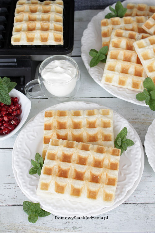 Ciasto francuskie rozwijamy. Tniemy na prostokąty takie aby zmieściły się do gofrownicy (u mnie ok. 9×11 cm). Pocięte ciasto francuskie partiami pieczemy w gofrownicy, aż gofry będą rumiane. Gotowe gofry podajemy z ulubionymi dodatkami.