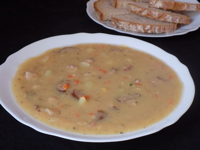Składniki: 500 g grochu łuskanego4-5 ziemniaków500 g wędzonych kości200 g wędzonego boczku250…