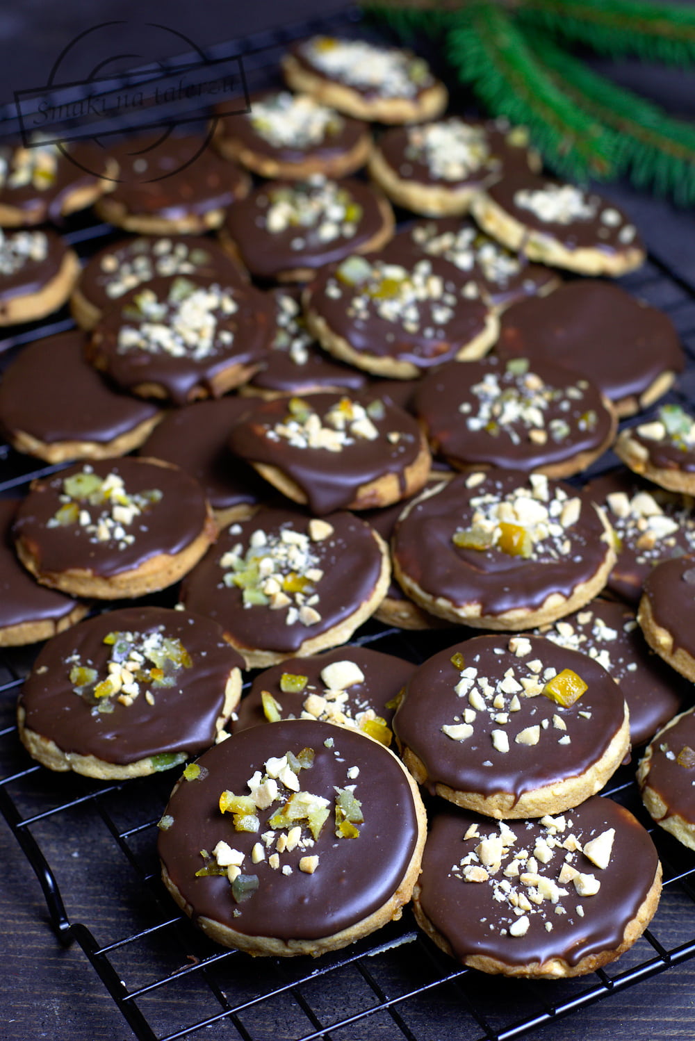 Kruche ciasteczka z orzeszkami ziemnymi i skórką pomarańczową oblane czekoladą, z dodatkową ilością orzeszków i skórki na wierzchu. Niby proste, a jednak bardzo wykwintne.